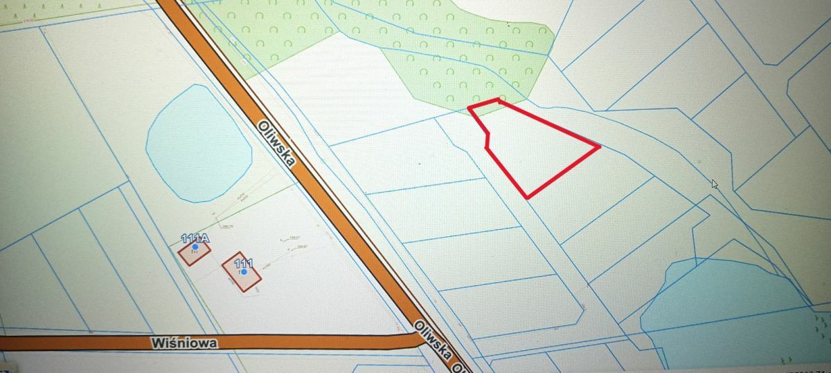 Działka w kształcie zbliżonym do trapezu, płaska, od jednej strony ściana lasu.